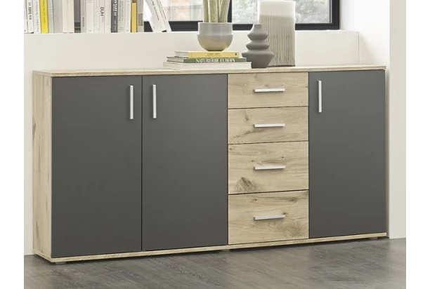 Komoda so 4 zásuvkami z radu Bacalar má jednoducho praktický dizajn v kombinácii drevodekoru dub viking so šedými prednými plochami. Táto komoda so šírkou 160 cm ponúka 3 otočné dvere a 4 zásuvky na univerzálne ukladanie akýchkoľvek vecí.