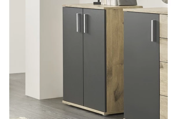 Skrinka 2-dverová z radu Bacalar má jednoducho praktický dizajn v kombinácii drevodekoru dub viking so šedými prednými plochami. Táto skrinka so šírkou 60 cm ponúka 2 otočné dvere s vnútorným úložným priestorom pre univerzálne ukladanie akýchkoľvek vecí.