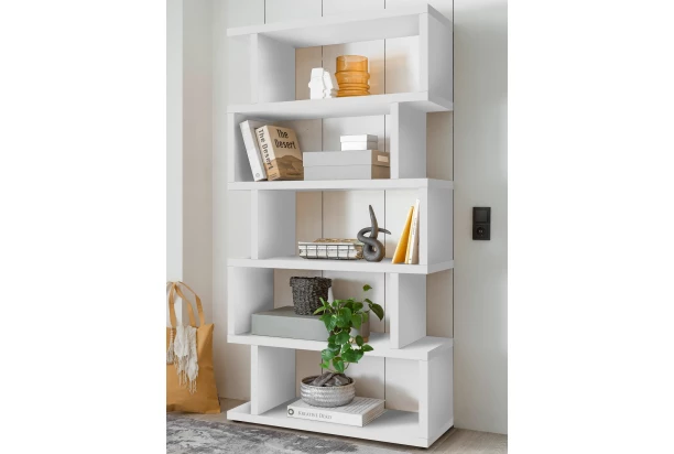 Regál s výškou 189 cm je vyrobený v bielej farbe a má zaujímavo členitú konštrukciu s piatimi poschodiami priehradok, ktoré môžete využiť napríklad na odkladanie knižiek, obľúbených predmetov alebo dekorácií. Tento moderný regál sa bude hodiť nielen do obývačky, ale aj do jedálne, spálne, pracovne alebo detskej izby.