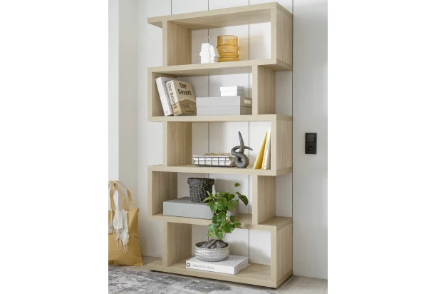 Regál s výškou 189 cm je vyrobený v dekore dub sonoma a má zaujímavo členitú konštrukciu s piatimi poschodiami priehradok, ktoré môžete využiť napríklad na odkladanie knižiek, obľúbených predmetov alebo dekorácií. Tento moderný regál sa bude hodiť nielen do obývačky, ale aj do jedálne, spálne, pracovne alebo detskej izby.