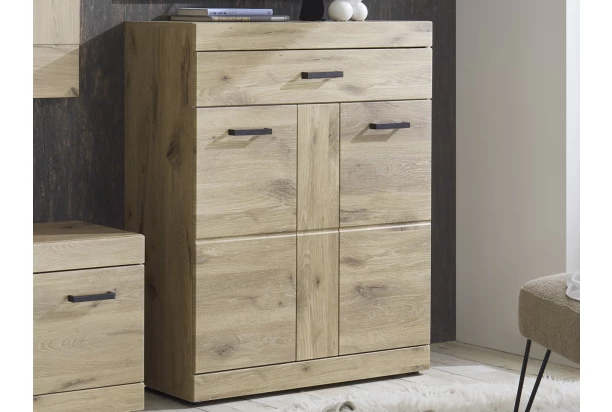Predsieňová komoda/botník z kolekcie Barcelo – nábytok v drevodekore dub viking dodá priestoru predsiene veľmi útulnú domácku klímu. Široké rámy spolu s členitými líniami dodávajú nábytku masívnejší efekt. Tento nábytok sa hodí ako do moderného, tak do klasicky zariadeného interiéru.
