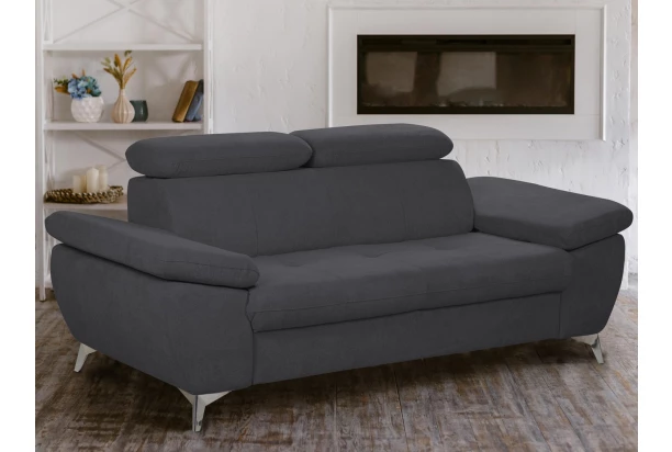 Moderný trojsedák v trendovom štýle, ponúka komfortné sedenie, ktoré navyše dopĺňajú polohovateľné podrúčky a polohovateľné chrbtové opierky – ľahko si tak môžete prispôsobiť štýl sedenia podľa Vašej individuálnej potreby. Trojmiestna pohovka je očalúnená príjemne mäkkou štruktúrovanou látkou v odtieni antracitová tmavo šedá. Kovová podnož v chrómovo lesklom prevedení, pôsobí vzdušne a navyše umožňuje využiť aj váš robotický vysávač. Trojsedák pre komfortnú, modernú a zároveň praktickú domácnosť.
