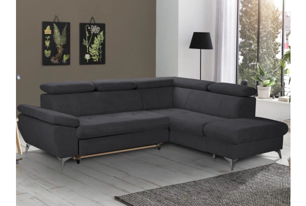 Moderná rohová sedacia súprava v trendovom štýle ponúka komfortné sedenie, ktoré navyše dopĺňajú polohovateľné podrúčky a polohovateľné chrbtové opierky – ľahko si tak môžete prispôsobiť štýl sedenia podľa Vašej individuálnej potreby. Rohová sedačka tvorí pravý roh a je očalúnená príjemne mäkkou štruktúrovanou látkou v odtieni antracitová tmavo šedá. Kovová podnož v chrómovo lesklom prevedení pôsobí vzdušne a navyše umožňuje využiť aj váš robotický vysávač. Táto sedačka je zároveň vybavená rozkladacou funkciou na príležitostné lôžko a taktiež úložným priestorom pod otomanom. Skrátka sedačka pre komfortnú, modernú a zároveň praktickú domácnosť.