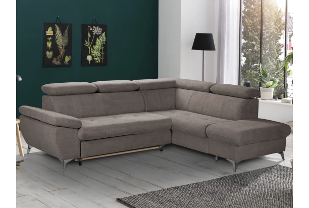 Moderná rohová sedacia súprava v trendovom štýle ponúka komfortné sedenie, ktoré navyše dopĺňajú polohovateľné podrúčky a polohovateľné chrbtové opierky – ľahko si tak môžete prispôsobiť štýl sedenia podľa Vašej individuálnej potreby. Rohová sedačka tvorí pravý roh a je očalúnená príjemne mäkkou štruktúrovanou látkou v odtieni hnedo-béžová taupe. Kovová podnož v chrómovo lesklom prevedení pôsobí vzdušne a navyše umožňuje využiť aj váš robotický vysávač. Táto sedačka je zároveň vybavená rozkladacou funkciou na príležitostné lôžko a taktiež úložným priestorom pod otomanom. Skrátka sedačka pre komfortnú, modernú a zároveň praktickú domácnosť.