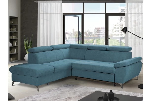 Moderná rohová sedacia súprava v trendovom štýle ponúka komfortné sedenie, ktoré navyše dopĺňajú polohovateľné podrúčky a polohovateľné chrbtové opierky – ľahko si tak môžete prispôsobiť štýl sedenia podľa Vašej individuálnej potreby. Rohová sedačka tvorí ľavý roh a je očalúnená príjemne mäkkou štruktúrovanou látkou v odtieni modrá. Kovová podnož v chrómovo lesklom prevedení pôsobí vzdušne a navyše umožňuje využiť aj váš robotický vysávač. Táto sedačka je zároveň vybavená rozkladacou funkciou na príležitostné lôžko a taktiež úložným priestorom pod otomanom. Skrátka sedačka pre komfortnú, modernú a zároveň praktickú domácnosť.