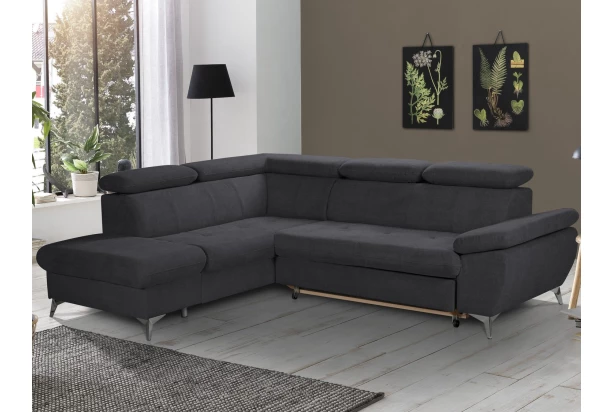 Moderná rohová sedacia súprava v trendovom štýle ponúka komfortné sedenie, ktoré navyše dopĺňajú polohovateľné podrúčky a polohovateľné chrbtové opierky – ľahko si tak môžete prispôsobiť štýl sedenia podľa Vašej individuálnej potreby. Rohová sedačka tvorí ľavý roh a je očalúnená príjemne mäkkou štruktúrovanou látkou v odtieni antracitová tmavo šedá. Kovová podnož v chrómovo lesklom prevedení pôsobí vzdušne a navyše umožňuje využiť aj váš robotický vysávač. Táto sedačka je zároveň vybavená rozkladacou funkciou na príležitostné lôžko a taktiež úložným priestorom pod otomanom. Skrátka sedačka pre komfortnú, modernú a zároveň praktickú domácnosť.