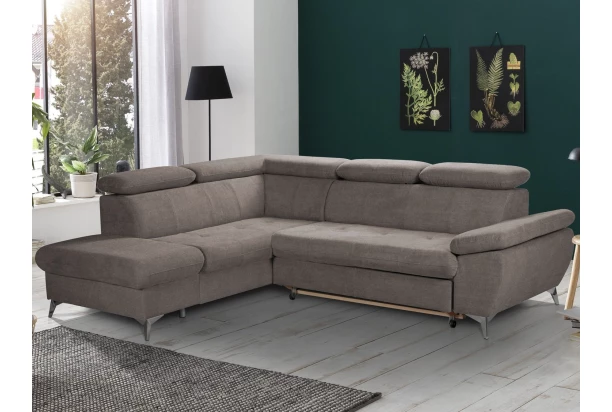 Moderná rohová sedacia súprava v trendovom štýle ponúka komfortné sedenie, ktoré navyše dopĺňajú polohovateľné podrúčky a polohovateľné chrbtové opierky – ľahko si tak môžete prispôsobiť štýl sedenia podľa Vašej individuálnej potreby. Rohová sedačka tvorí ľavý roh a je očalúnená príjemne mäkkou štruktúrovanou látkou v odtieni hnedo-béžová taupe. Kovová podnož v chrómovo lesklom prevedení pôsobí vzdušne a navyše umožňuje využiť aj váš robotický vysávač. Táto sedačka je zároveň vybavená rozkladacou funkciou na príležitostné lôžko a taktiež úložným priestorom pod otomanom. Skrátka sedačka pre komfortnú, modernú a zároveň praktickú domácnosť.