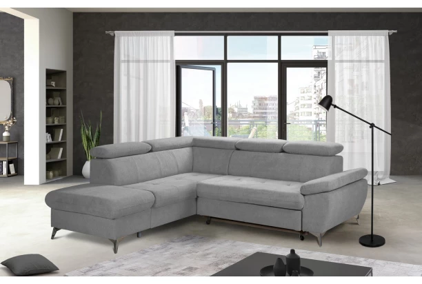 Moderná rohová sedacia súprava v trendovom štýle ,ponúka komfortné sedenie, ktoré navyše dopĺňajú polohovateľné podrúčky a polohovateľné chrbtové opierky – ľahko si tak môžete prispôsobiť štýl sedenia podľa Vašej individuálnej potreby. Rohová sedačka tvorí ľavý roh a je očalúnená príjemne mäkkou štruktúrovanou látkou v odtieni svetlo šedá. Kovová podnož v chrómovo lesklom prevedení pôsobí vzdušne a navyše umožňuje využiť aj váš robotický vysávač. Táto sedačka je zároveň vybavená rozkladacou funkciou na príležitostné lôžko a taktiež úložným priestorom pod otomanom. Skrátka sedačka pre komfortnú, modernú a zároveň praktickú domácnosť.