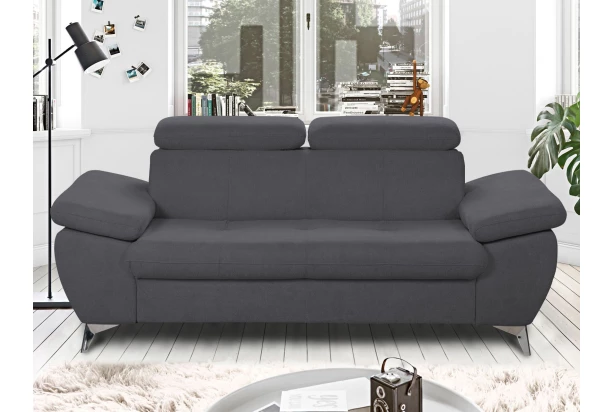 Moderný dvojsedák v trendovom štýle, ponúka komfortné sedenie, ktoré navyše dopĺňajú polohovateľné podrúčky a polohovateľné chrbtové opierky – ľahko si tak môžete prispôsobiť štýl sedenia podľa Vašej individuálnej potreby. Dvojmiestna pohovka je očalúnená príjemne mäkkou štruktúrovanou látkou v odtieni antracitová tmavo šedá. Kovová podnož v chrómovo lesklom prevedení, pôsobí vzdušne a navyše umožňuje využiť aj váš robotický vysávač. Dvojsedák pre komfortnú, modernú a zároveň praktickú domácnosť.
