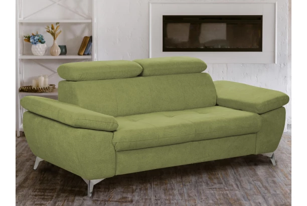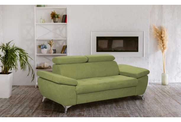 Moderný trojsedák v trendovom štýle, ponúka komfortné sedenie, ktoré navyše dopĺňajú polohovateľné podrúčky a polohovateľné chrbtové opierky – ľahko si tak môžete prispôsobiť štýl sedenia podľa Vašej individuálnej potreby. Trojmiestna pohovka je očalúnená príjemne mäkkou štruktúrovanou látkou v odtieni zelená. Kovová podnož v chrómovo lesklom prevedení, pôsobí vzdušne a navyše umožňuje využiť aj váš robotický vysávač. Trojsedák pre komfortnú, modernú a zároveň praktickú domácnosť.