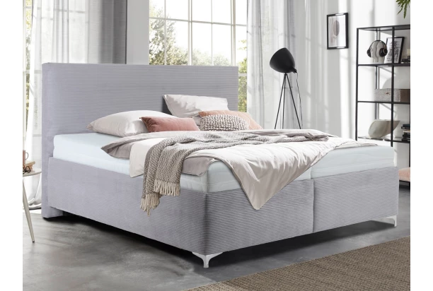 Manželská posteľ o veľkosti lôžka 180×200 cm je očalúnená útulne mäkkou látkou s prúžkovanou štruktúrou vo farbe svetlo šedá. Lôžko postele je vybavené polohovateľnými roštami, cez ktoré sa dostanete k objemným úložným priestorom. Posteľ má navyše praktické rozmery, vďaka ktorým sa zmestí aj do úzkeho priestoru spálne.