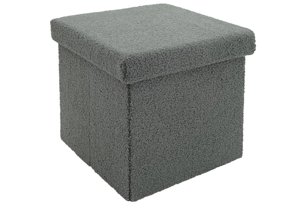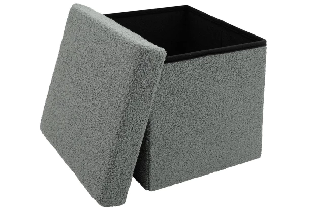 Štvorcový taburet s praktickým úložným priestorom je potiahnutý príjemne mäkučkou kučeravou látkou vo farbe šedá. Vďaka skladacej konštrukcii je možné taburet ľahko uschovať a zložiť v prípade potreby.
