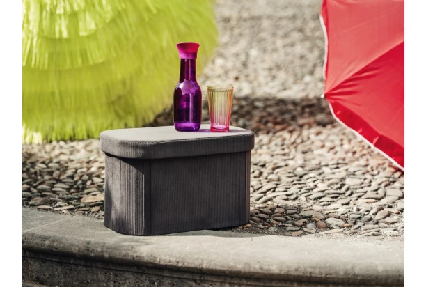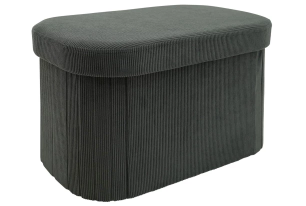 Malý oválny taburet s mäkkučkou štruktúrovanou látkou vo farbe šedá pod sedákom ponúka úložný priestor. Vďaka skladacej konštrukcii je možné taburet ľahko uschovať a opätovne zložiť v prípade potreby.
