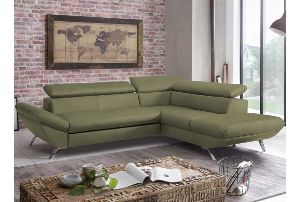 Rohová sedacia súprava zaujme moderným dizajnom tvarov. Oceníte pohodlné sedenie, ktoré dopĺňajú polohovateľné chrbtové opierky, vďaka ktorým si prispôsobíte štýl sedenia podľa aktuálnej potreby. Rohová sedačka s otomanom tvorí pravý roh a je očalúnená jemne štruktúrovanou látkou v odtieni olivovo zelená. Pod otomanom nájdete praktický úložný priestor. Sedačku môžete vďaka rozkladacej funkcii ľahko premeniť na lôžko na príležitostné spanie. Moderná kovová podnož korešponduje s tvarmi sedačky a umožňuje využiť počas upratovania aj váš robotický vysávač. Táto pohodlná rohová sedačka rozmerovo dobre pasuje aj do menšieho priestoru obývačky.