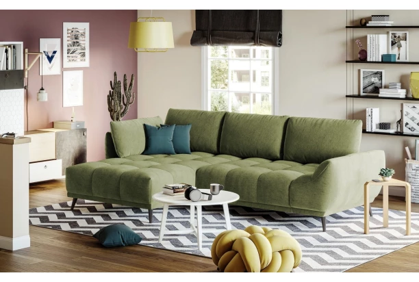 Rohová sedačka Allegra zaujme zaujímavým dizajnom a zároveň vytvorí pohodlné zákutia v priestore každej obývačky. Zaoblené tvary sedačky dopĺňa výrazné prešívanie komfortného priestorného sedadla a veľké vankúše. Rohová sedacia súprava s bočným otomanom tvorí ľavý roh. Očalúnená mäkkou a jemne štruktúrovanou látkou vo farbe trávovo zelená. Sedačku je možné vďaka rozkladacej funkcii na lôžko využiť aj na príležitostné spanie. Pod sedákom navyše nájdete praktický úložný priestor.