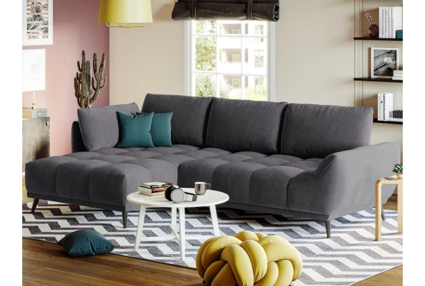 Rohová sedačka Allegra zaujme zaujímavým dizajnom a zároveň vytvorí pohodlné zákutia v priestore každej obývačky. Zaoblené tvary sedačky dopĺňa výrazné prešívanie komfortného priestorného sedadla a veľké vankúše. Rohová sedacia súprava s bočným otomanom tvorí ľavý roh. Očalúnená mäkkou a jemne štruktúrovanou látkou vo farbe antracitová. Sedačku je možné vďaka rozkladacej funkcii na lôžko využiť aj na príležitostné spanie. Pod sedákom navyše nájdete praktický úložný priestor.