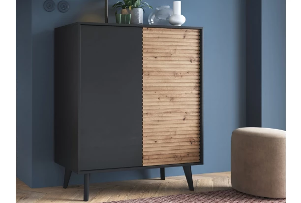 Vysoká skrinka z kolekcie Willow – čierny nábytok v kombinácii so štruktúrovanými povrchmi v drevodekore dub artisan pôsobí v interiéri nielen zaujímavo, ale zároveň aj útulne. Čierne nohy z masívneho dreva dodávajú stabilitu a pritom umožňujú jednoduchú údržbu podlahy. Nábytok je tak moderný, atraktívny na pohľad a zároveň praktický.