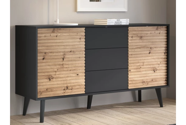 Široká komoda so zásuvkami z kolekcie Willow – čierny nábytok v kombinácii so štruktúrovanými povrchmi v drevodekore dub artisan pôsobí v interiéri nielen zaujímavo, ale zároveň aj útulne. Čierne nohy z masívneho dreva dodávajú stabilitu a pritom umožňujú jednoduchú údržbu podlahy. Nábytok je tak moderný, atraktívny na pohľad a zároveň praktický.