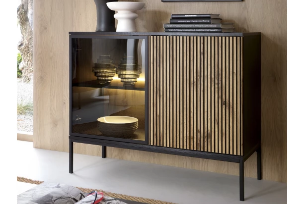Skrinka z kolekcie Sento – štýlový nábytok pre tých, ktorí chcú mať interiér zariadený moderne, prakticky a zároveň útulne. Čierne povrchy dopĺňajú útulné tóny dubového drevodekoru s profiláciou, ktorá vytvára na predných plochách zaujímavý lamelový efekt. Čierny rám presklenia dokonale pasuje k čiernej kovovej podnoži. Vďaka zvýšenej podnoži tak môže byť pre vás údržba podlahy jednoduchšia. Vnútorný presklený priestor s osvetlením dopĺňa príjemnú večernú atmosféru.