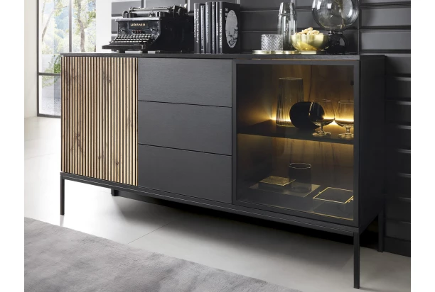 Komoda so zásuvkami z kolekcie Sento – štýlový nábytok pre tých, ktorí chcú mať interiér zariadený moderne, prakticky a zároveň útulne. Čierne povrchy dopĺňajú útulné tóny dubového drevodekoru s profiláciou, ktorá vytvára na predných plochách zaujímavý lamelový efekt. Čierny rám presklenia dokonale pasuje k čiernej kovovej podnoži. Vďaka zvýšenej podnoži tak môže byť pre vás údržba podlahy jednoduchšia. Vnútorný presklený priestor s osvetlením dopĺňa príjemnú večernú atmosféru.