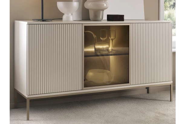 Široká skrinka z kolekcie Sento – štýlový nábytok pre tých, ktorí chcú mať interiér zariadený moderne, prakticky a zároveň útulne. Jemné kašmírovo béžové povrchy dopĺňa profilácia, ktorá vytvára na predných plochách zaujímavý lamelový efekt. Rám presklenia z kovu v elegantnom odtieni šampaň dokonale ladí s kovovou podnožou v rovnakom tóne. Vďaka zvýšenej podnoži tak môže byť pre vás údržba podlahy jednoduchšia. Vnútorný presklený priestor s osvetlením dopĺňa príjemnú večernú atmosféru.