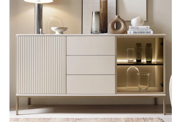 Komoda so zásuvkami z kolekcie Sento – štýlový nábytok pre tých, ktorí chcú mať interiér zariadený moderne, prakticky a zároveň útulne. Jemné kašmírovo béžové povrchy dopĺňa profilácia, ktorá vytvára na predných plochách zaujímavý lamelový efekt. Rám presklenia z kovu v elegantnom odtieni šampaň dokonale ladí s kovovou podnožou v rovnakom tóne. Vďaka zvýšenej podnoži tak môže byť pre vás údržba podlahy jednoduchšia. Vnútorný presklený priestor s osvetlením dopĺňa príjemnú večernú atmosféru.