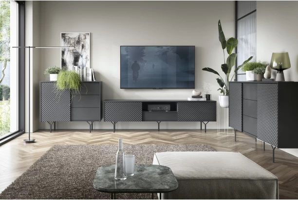 Skrinka so zásuvkami z kolekcie Raven – nábytok v modernom dizajne zaujme štruktúrovanými povrchmi, ktoré dodávajú nezameniteľný vzhľad. Čierny nábytok opticky odľahčujú čierno lakované kovové nôžky, ktoré dodávajú stabilitu a zároveň umožňujú jednoduchú údržbu podlahy. Tento nábytok dokonale doplní interiér moderne zariadeného bytu.