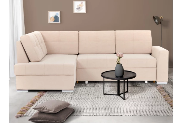 Sympaticky tvarovaná rohová sedacia súprava s otomanom vytvára ľavý roh. Očalúnená jemne štruktúrovanou látkou vo farbe béžová. Obsahuje úložný priestor aj funkciu rozkladu na lôžko, ktoré je možné využívať aj na trvalé spanie. Sedačka so svojim štýlom sa hodí takmer do akéhokoľvek zariadeného bytu, kde poskytne kvalitné pohodlné sedenie.