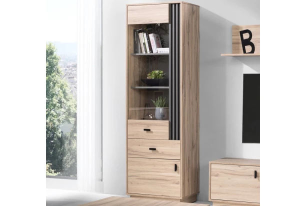 Vysoká vitrína z kolekcie Almo – zaujímavý dizajn nábytku ozvláštňuje antracitová štruktúra lamiel, ktorá vyniká v kontraste so svetlými plochami dubového drevodekoru. Tento nábytok upúta pozornosť na pohľad a zároveň plní svoj praktický účel.