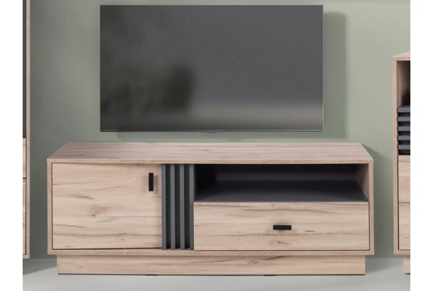 TV skrinka so šírkou 125 cm z kolekcie Almo – zaujímavý dizajn nábytku ozvláštňuje antracitová štruktúra lamiel, ktorá vyniká v kontraste so svetlými plochami dubového drevodekoru. Tento nábytok upúta pozornosť na pohľad a zároveň plní svoj praktický účel.