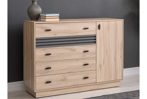 Komoda so šuplíkmi z kolekcie Ancona- zaujímavý dizajn nábytku ozvláštňuje antracitová štruktúra lamiel, ktorá vyniká v kontraste so svetlými plochami dubového drevodekoru. Tento nábytok upúta pozornosťou na pohľad a zároveň plní svoj praktický účel.