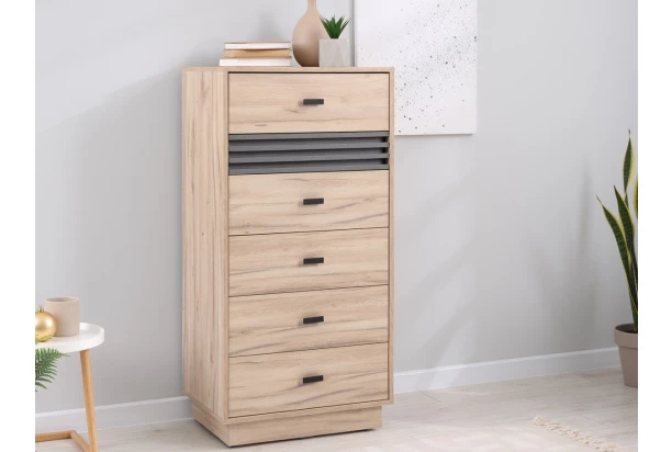 Komoda so zásuvkami z kolekcie Ancona- zaujímavý dizajn nábytku ozvláštňuje antracitová štruktúra lamiel, ktorá vyniká v kontraste so svetlými plochami dubového drevodekoru. Tento nábytok upúta pozornosťou na pohľad a zároveň plní svoj praktický účel.