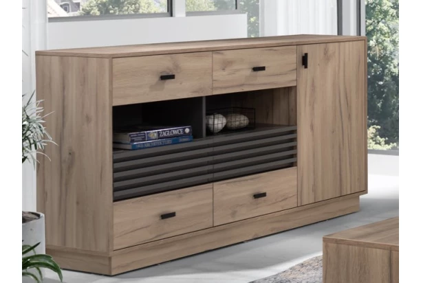 Široká komoda z kolekcie Almo – zaujímavý dizajn nábytku ozvláštňuje antracitová štruktúra lamiel, ktorá vyniká v kontraste so svetlými plochami dubového drevodekoru. Tento nábytok upúta pozornosť na pohľad a zároveň plní svoj praktický účel.