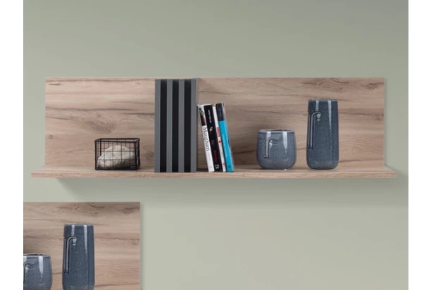 Nástenná polica so šírkou 110 cm z kolekcie Almo – zaujímavý dizajn nábytku ozvláštňuje antracitová štruktúra lamiel, ktorá vyniká v kontraste so svetlými plochami dubového drevodekoru. Tento nábytok upúta pozornosť na pohľad a zároveň plní svoj praktický účel.