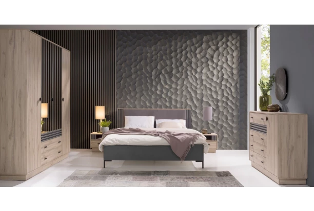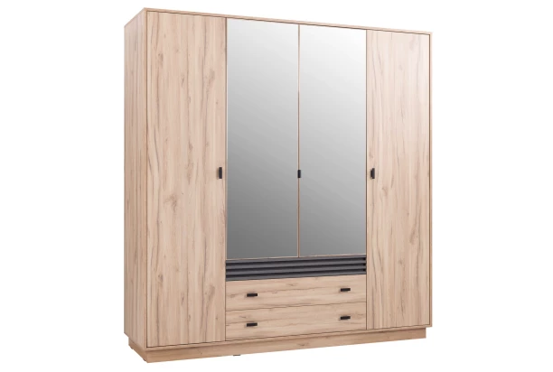 Šatníková skriňa s otočnými dverami a zrkadlami z kolekcie Almo – zaujímavý dizajn nábytku ozvláštňuje antracitová štruktúra lamiel, ktorá vyniká v kontraste so svetlými plochami dubového drevodekoru. Tento nábytok upúta pozornosťou na pohľad a zároveň plní svoj praktický účel.