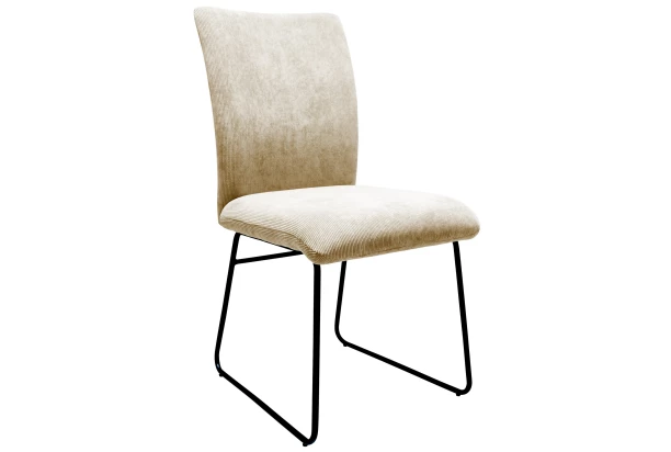 Pohodlne tvarovaná jedálenská stolička je očalúnená mäkučkou štruktúrovanou látkou vo farbe svetlobéžová. Moderný štýl dopĺňa kovová čierna podnož, ktorá dodáva tejto komfortnej stoličke potrebnú stabilitu.