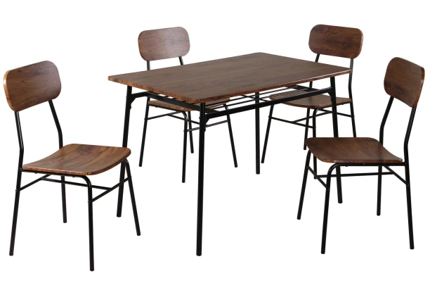 Jednoduchý jedálenský set v dekore orech má stabilnú konštrukciu z čierneho kovu a hodí sa do akejkoľvek klasickej kuchyne alebo jedálne. Tento jedálenský set obsahuje celkom 5 dielov – obdĺžny jedálenský stôl o veľkosti 110×70 cm a štyri stoličky.