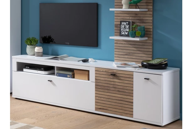 TV skrinka z kolekcie Rovigo – nábytok pre tých, ktorí chcú mať domov zariadený moderne, prakticky a zároveň útulne. Čisté biele matné plochy skvele kontrastujú s hrejivými tónmi dubového drevodekoru v zaujímavej optike s lamelovým efektom. Skrinka ponúka otvorené priehradky, dvierka aj zásuvku, za ktorými nájdete praktické vnútorné úložné priestory.