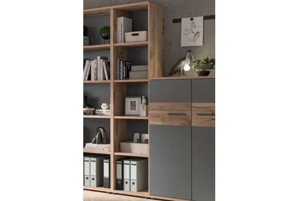 Vysoký regál z kolekcie Mason – moderný a praktický nábytok v kombinácii drevodekoru dub nox a šedých plôch. Regál so šírkou 40 cm obsahuje 5 priehradiek. Odkladacia polica ponúka veľkorysý úložný priestor pre knihy, šanóny, kúpeľňové potreby, bytové doplnky a ďalšie predmety. S niekoľkými otvorenými policami a robustnou konštrukciou umožňuje efektívnu organizáciu a skladovanie. Odkladacie police sú ideálne na usporiadanie kníh, zložiek a pracovných materiálov v pracovni, kúpeľňových potrieb v kúpeľni alebo dekoratívnych predmetov v obývacej izbe. Regál je možné využiť v akejkoľvek miestnosti.