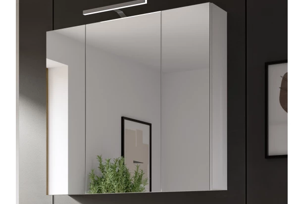 Kúpeľňová zrkadlová skrinka z programu Vira – nadčasový, minimalistický a zároveň funkčný nábytok v bielom prevedení pasuje do každej modernej kúpeľne. Závesná skrinka so šírkou 82 cm má 3 otočné dvere a vnútorné úložné priestory s poličkami na uschovanie kozmetiky a ďalšie toaletných potrieb.