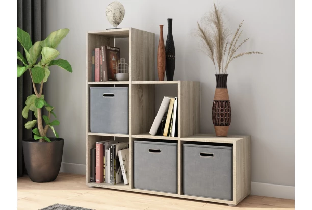 Praktický regál so 6 priehradkami je vyrobený v dekore dub sonoma a môžete ho umiestniť pozdĺžne alebo kolmo k stene. Otvorené priehradky je možné navyše doplniť napríklad úložnými boxmi, do ktorých ľahko uložíte rôzne drobnosti.