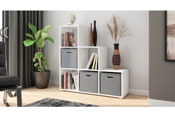 Praktický regál so 6 priehradkami je vyrobený v bielej farbe a môžete ho umiestniť pozdĺžne alebo kolmo k stene. Otvorené priehradky je možné navyše doplniť napríklad úložnými boxmi, do ktorých ľahko uložíte rôzne drobnosti.