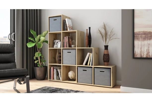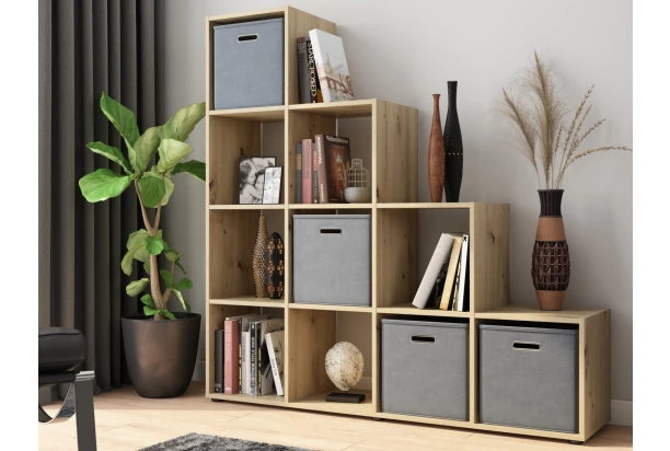 Praktický regál s 10 priehradkami je vyrobený v dekore dub artisan a môžete ho umiestniť pozdĺžne alebo kolmo k stene. Otvorené priehradky je možné navyše doplniť napríklad úložnými boxmi, do ktorých ľahko uložíte rôzne drobnosti.