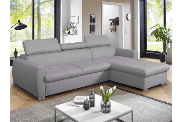 Pohodlná rohová sedacia súprava podľa aktuálnych trendov má príjemne mäkké vypolstrovanie a je vybavená polohovateľnými opierkami hlavy, vďaka ktorým si ľahko prispôsobíte sedenie podľa vlastnej potreby. Sedačka s otomanom tvorí pravý roh a svojimi ideálnymi rozmermi sa hodí takmer do každej obývačky. Je očalúnená jemne štruktúrovanou látkou vo farbe svetlo šedá a doplnená prešivom. Pod výklopným otomanom nájdete ľahko prístupný úložný priestor na uschovanie deky alebo vecí sezónnej potreby. Vaša návšteva ocení aj funkciu rozkladu na lôžko na príležitostné spanie, rozkladacie lôžko môžete využiť aj vy cez deň počas odpočinku. Táto rohová sedačka je tak pohodlná a zároveň aj praktická.