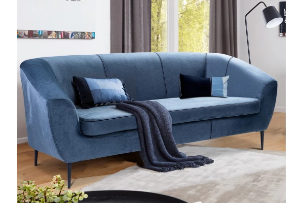 Elegantná trojmiestna pohovka na čiernych kovových nohách pôsobí vzdušne a pasuje takmer do akéhokoľvek interiéru. Táto pohodlne polstrovaná pohovka má ergonomicky zaoblené bočné podrúčky a je očalúnená zamatovo mäkkou látkou v odtieni modrá.