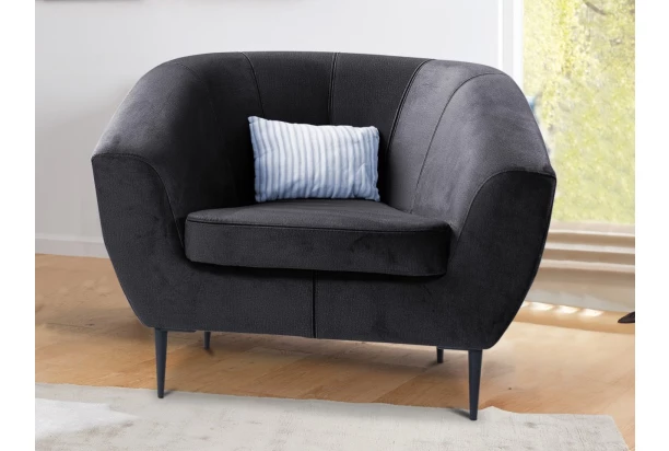 Elegantné kreslo na čiernych kovových nohách pôsobí vzdušne a pasuje takmer do akéhokoľvek interiéru. Toto pohodlne polstrované kreslo má ergonomicky zaoblené bočné podrúčky a je očalúnené atraktívnou zamatovou látkou v odtieni tmavo šedá, ktorá je na dotyk hladká, príjemne hebká a zároveň odolná, navyše vďaka lesklému efektu pôsobí luxusným dojmom.