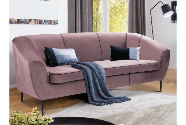 Elegantná trojmiestna pohovka na čiernych kovových nohách pôsobí vzdušne a pasuje takmer do akéhokoľvek interiéru. Táto pohodlne polstrovaná pohovka má ergonomicky zaoblené bočné podrúčky a je očalúnená atraktívnou zamatovou látkou v odtieni svetloružová, ktorá je na dotyk hladká, príjemne hebká a zároveň odolná, navyše vďaka lesklému efektu pôsobí luxusným dojmom.
