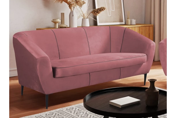 Elegantná trojmiestna pohovka na čiernych kovových nohách vyzerá vzdušne a hodí sa takmer do každého interiéru. Táto pohodlne čalúnená pohovka má ergonomicky zaoblené bočné lakťové opierky a je čalúnená atraktívnou zamatovou látkou v tmavoružovom odtieni, ktorá je hladká na dotyk, príjemne mäkká a zároveň odolná a vďaka lesklému efektu pôsobí luxusným dojmom.