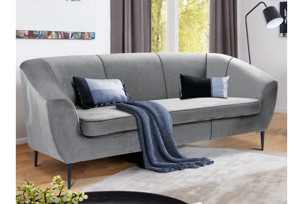 Elegantná trojmiestna pohovka na čiernych kovových nohách pôsobí vzdušne a pasuje takmer do akéhokoľvek interiéru. Táto pohodlne polstrovaná pohovka má ergonomicky zaoblené bočné podrúčky a je očalúnená atraktívnou zamatovou látkou v odtieni svetlo šedá, ktorá je na dotyk hladká, príjemne hebká a zároveň odolná, navyše vďaka lesklému efektu pôsobí luxusným dojmom.
