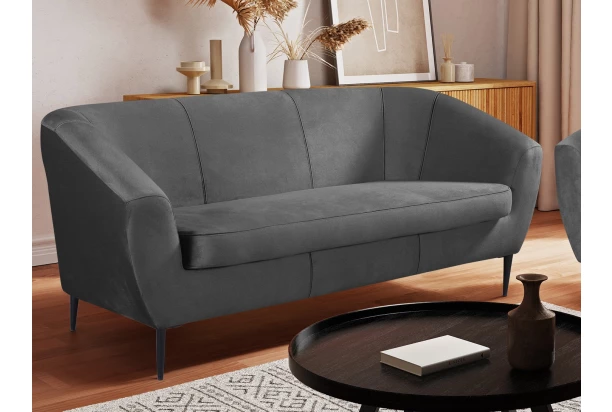 Elegantná trojmiestna pohovka na čiernych kovových nohách pôsobí vzdušne a pasuje takmer do akéhokoľvek interiéru. Táto pohodlne polstrovaná pohovka má ergonomicky zaoblené bočné podrúčky a je očalúnená atraktívnou zamatovou látkou v odtieni stredne šedá, ktorá je na dotyk hladká, príjemne hebká a zároveň odolná, navyše vďaka lesklému efektu pôsobí luxusným dojmom.